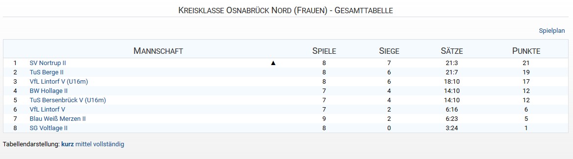 SG Voltlage II vs. TuS Berge II: Absolut chancenlos und völlig überfordert war das Voltlager Nachwuchsteam gegenüber den Berger Damen, so dass bereits nach 45 Minuten das Spiel vorbei war. Bemerkenswert 2 Berger Alltime Vereinsrekorde: Satzrekord: 25:1 Punkte: Aufschlagrekord 22 Aufschläge infolge für Wiebke Wolke!