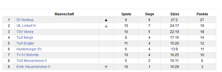 Mit einem ungefährdeten Auswärtssieg 0:3 / 46:75 (13:25 12:25 21:25) konnten die Damen des TuS Berge am ersatzgeschwächtem Tabellennachbarn TuS Engter vorbeiziehen. Aktuell stehen die Berger Damen auf Tabellenplatz 4. Leider ist die Tabelle aufgrund der wenigen Spiele der Damen aus Hunteburg (6 Spiele) und Bersenbrück (5 Spiele) stark verzerrt.